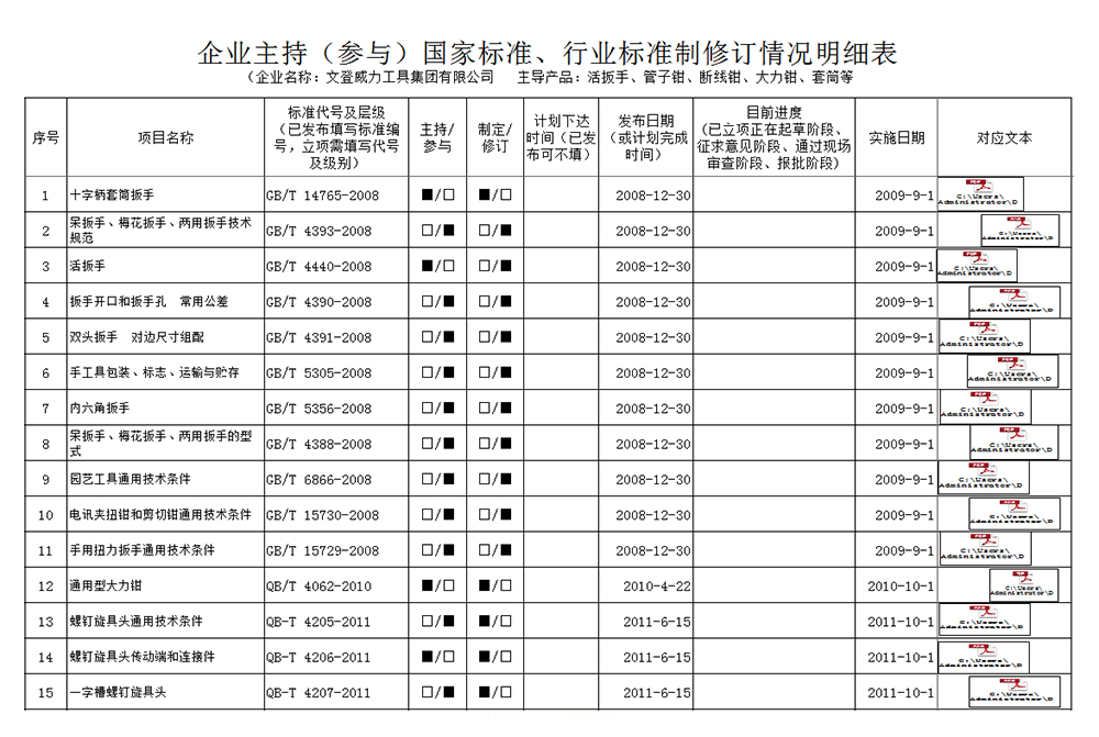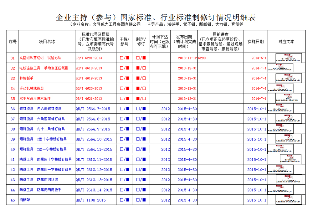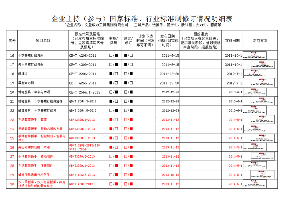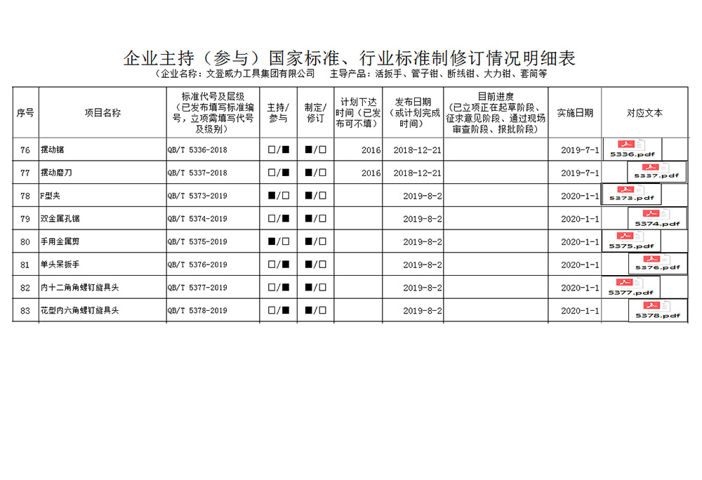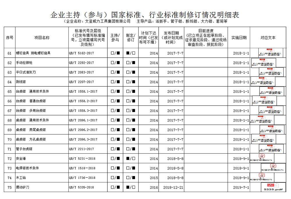 威力集團是中國五金標(biāo)委會成員單位,截止2019年年底主持或參與標(biāo)準(zhǔn)制修訂共計83項。